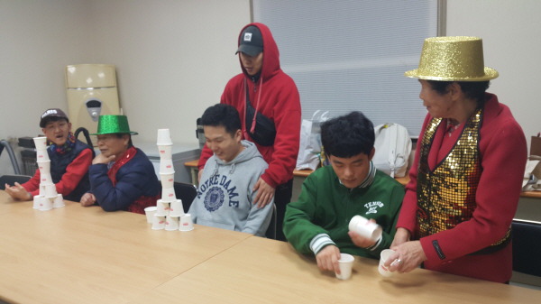 종이컵 쌓기와 손가락 그림 꾸미기를 하며 노인과 청년들의 세대를 어우르는