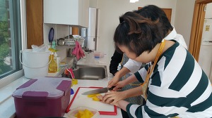 친구들과 김치볶음밥을 만들어 보았습니다. 김치와 단무지도 썰어보기도 하고 밥을 볶아주기도 하는 등 웃으면서 참여해주는